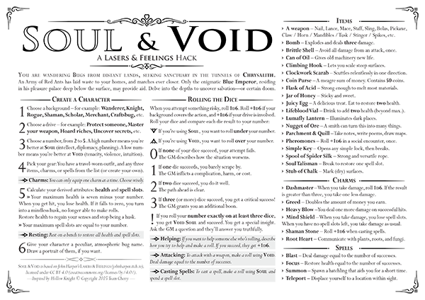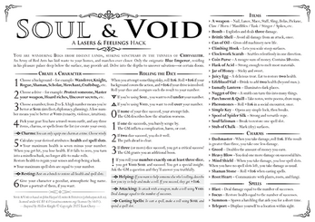 Soul & Void is a hack of John Harper's Lasers & Feelings, licensed under CC BY 4.0 (creativecommons.org/licenses/by/4.0/).